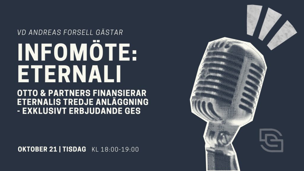 Välkommen till ett exklusivt digitalt investerarmöte med Otto & Partners. Den 21 oktober 2025 kl 18:00 presenterar vi vår största investering hittills och vår plan att finansiera den tredje anläggningen för Skogsaktiebolaget Eternali – ett steg mot kritisk massa (4–5 driftlagda anläggningar) och inför en möjlig exit.